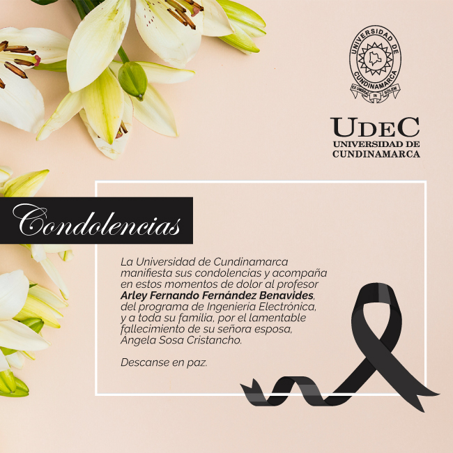 La Universidad de Cundinamarca manifiesta sus condolencias y acompaña en estos momentos de dolor al profesor Arley Fernando Fernández Benavides, del programa de Ingeniería Electrónica, y a toda su familia, por el lamentable fallecimiento de su señora esposa, Ángela Sosa Cristancho.