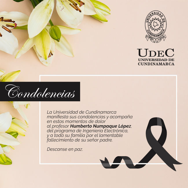 La Universidad de Cundinamarca manifiesta sus condolencias y acompaña en estos momentos de dolor al profesor Humberto Numpaque López, del programa de Ingeniería Electrónica, y a toda su familia por el lamentable fallecimiento de su señor padre.