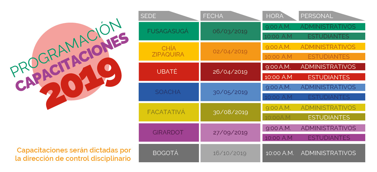La Dirección de Control Disciplinario en cumplimiento de su función preventiva realizará para el año en curso capacitaciones dirigidas al personal docente, administrativos y estudiantes, relacionadas con el tema de ACOSO LABORAL y generalidades del proceso disciplinario, así como socialización del REGLAMENTO ESTUDIANTIL de la Universidad de Cundinamarca (ACUERDO 010 de 2006 y 012 de 2010).