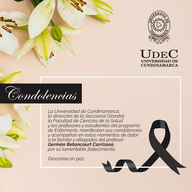 La Universidad de Cundinamarca, la dirección de la Seccional Girardot, la Facultad de Ciencias de la Salud y los profesores y estudiantes del programa de Enfermería, manifiestan sus condolencias y acompañan en estos momentos de dolor a la familia y allegados del profesor Germán Betancourt Carrizosa, por su lamentable fallecimiento.