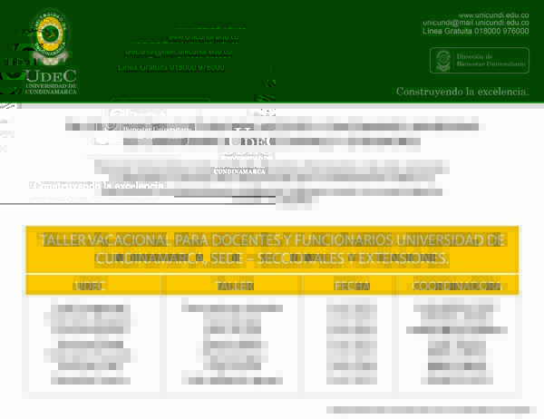 Bienestar Universitario, invita a todos los Docentes y Funcionarios de las sedes, seccionales y extensiones, a participar de la programación que la Coordinación de Cultura, ha diseñado para su entretenimiento y relajación. Esperamos contar con su participación.