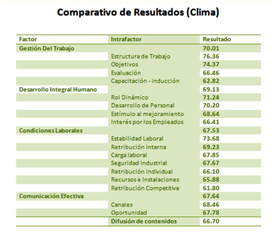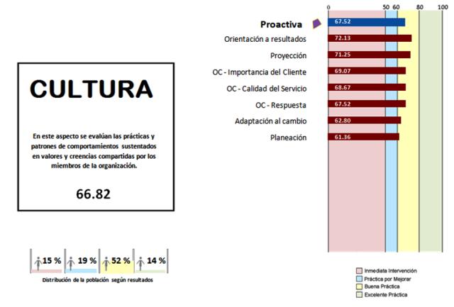 En este aspecto se evalúan las prácticas y patrones de comportamientos sustentados en valores y creencias compartidas por los miembros de la organización, 66.82 fue el promedio que arrojó la medición.