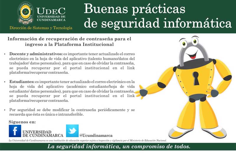 La Dirección de Sistemas y Tecnología de la Universidad de Cundinamarca, continúa la campaña de buenas prácticas de seguridad informática.