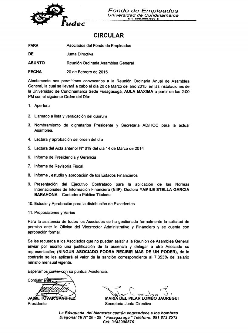 Atentamente el Fondo de Empleados de la Universidad de Cundinamarca, se permite invitar a sus afiliados a la Reunión Anual de Asamblea General.
