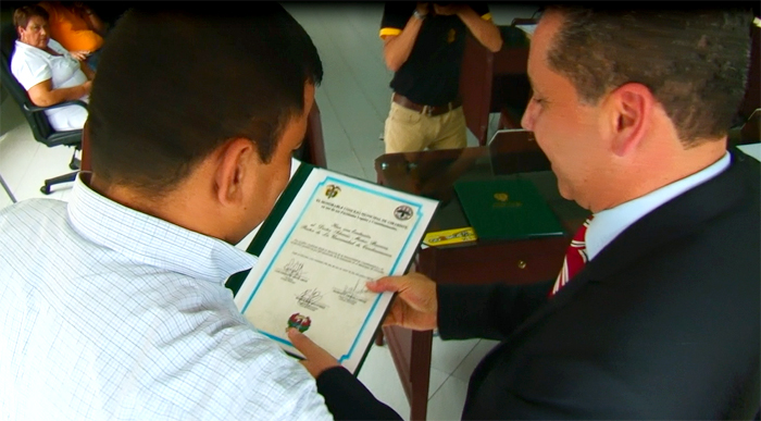 El rector de la Universidad Dr. Adriano Muñoz Barrera, recibe el reconocimiento del Dr. Geovanni Ortiz Arias, presidente del Concejo Municipal de Girardot