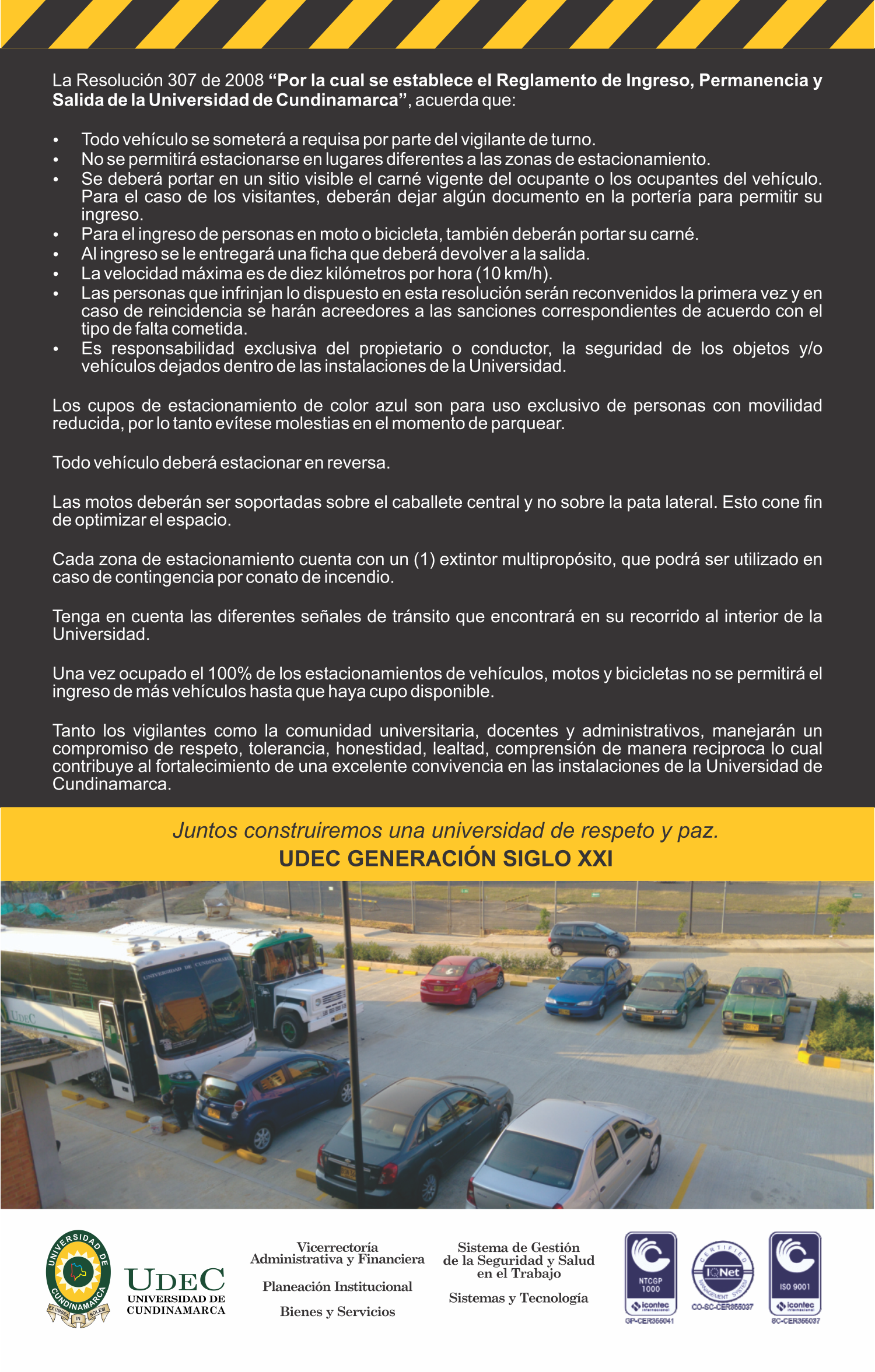 Cordialmente, se le informa a la comunidad udecina que terminada la adecuación de las zonas de estacionamiento en la Sede Fusagasgugá, se realizará la jornada pedagógica de CULTURA VIAL UDEC, que iniciará el día jueves 04 de febrero y culminará el viernes 19 de febrero de 2016. Esta jornada tiene como finalidad indicar a los udecinos la distribución de las zonas establecidas para el adecuado uso de los parqueaderos.