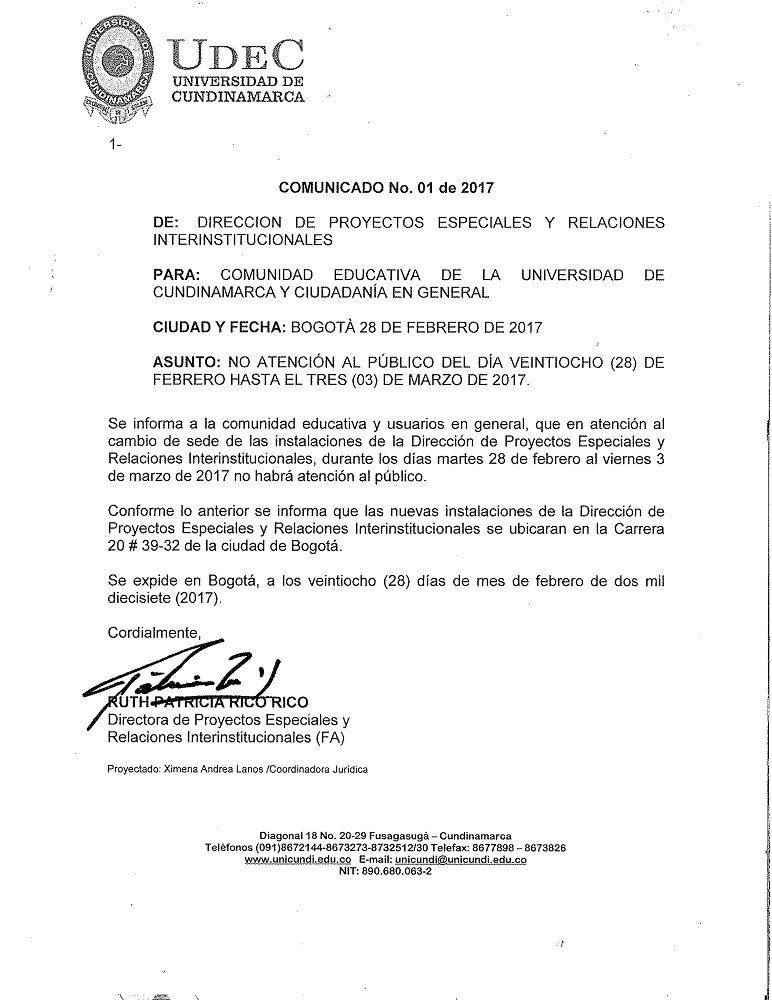 La Dirección de Proyectos Especiales y Relaciones Interinstitucionales de la Universidad de Cundinamarca da a conocer el siguiente comunicado: